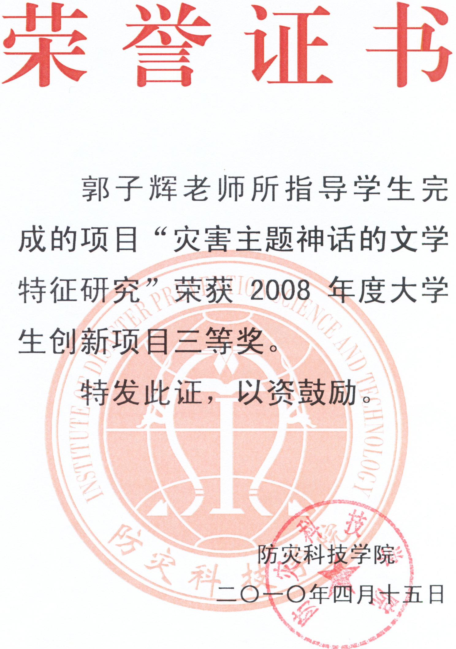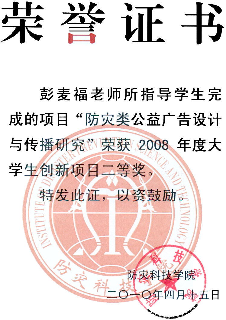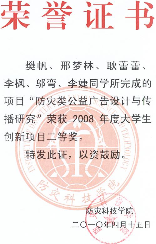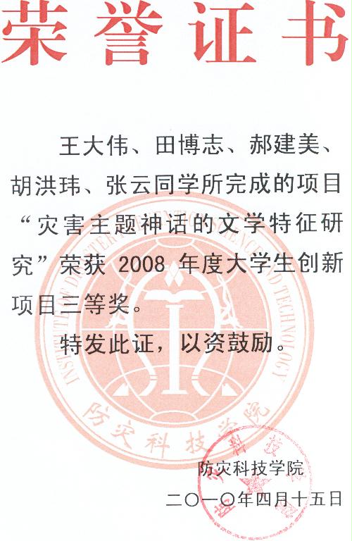 2010年5月6日下午, 第一届beat365英国官方网站大学生创新项目汇报暨表彰大会在图书馆报告厅隆重举行。我系申报的两个创新项目均获奖,其中王大伟、田博志、郝建美、胡宏玮、张云同学所完成的项目“灾害主题神话的文学特征研究”荣获2008年度大学生创新项目三等奖,并于2010年4月在beat365英国官方网站学报增刊1发表题为《从灾害主题神话看先民的应灾心理》的论文;广告学专业樊帆、邢梦林、李枫、耿蕾蕾、邬弯、李婕所完成的项目“防灾类公益广告设计与传播研究”荣获2008年度大学生创新项目二等奖,并于2010年4月在beat365英国官方网站学报增刊1发表题为《防灾减灾主题公益广告技法浅究》的论文。