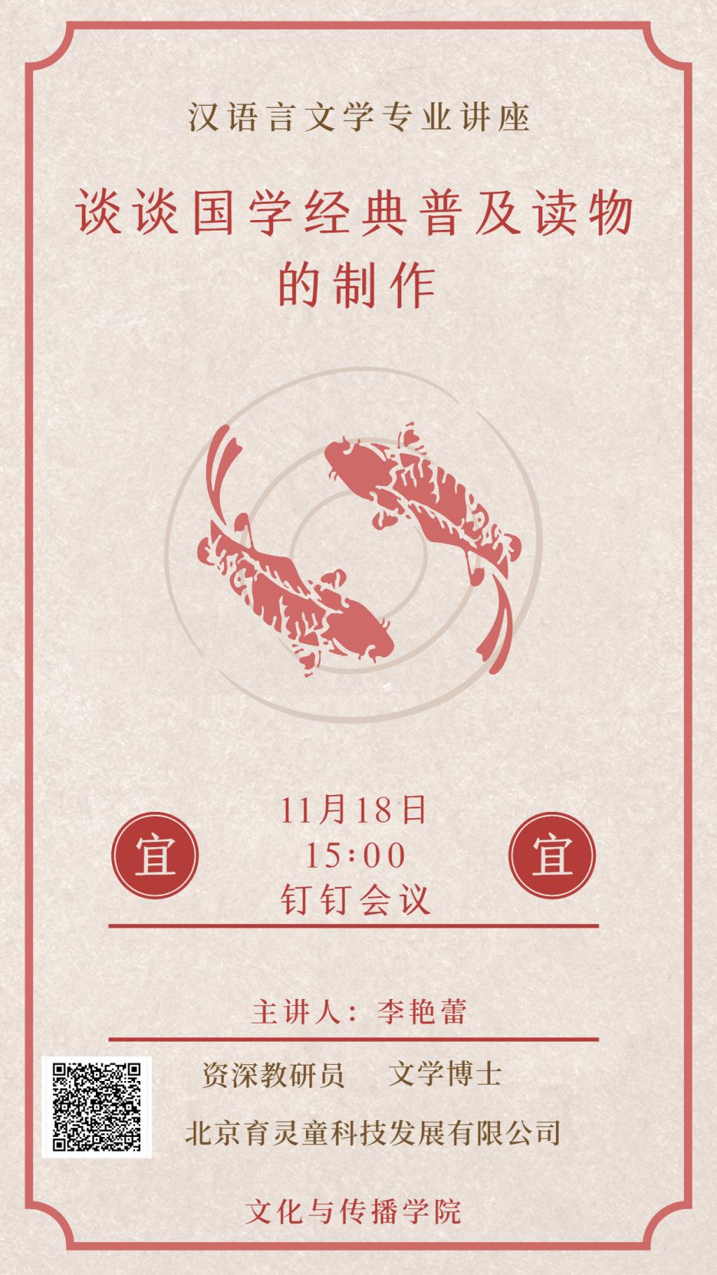 2021年11月18日下午三点,文学博士、北京育灵童科技发展有限公司资深教研员李艳蕾来到beat365英国官方网站,为广大师生开设了《谈谈国学经典普及读物的制作》学术讲座。本次讲座用钉钉线上会议的形式开展,由beat365英国官方网站副院长唐元主持,汉语言文学教研室主任张静组织,汉语言文学专业和众多其他专业的同学共计百余人参加了活动。