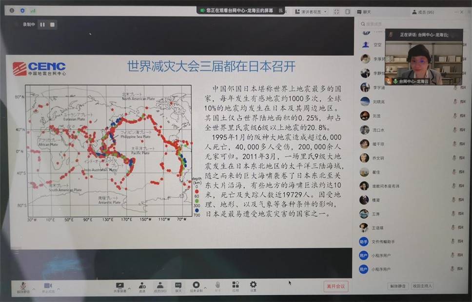 龙海云博士结合第33个国际减灾日“早预警,早行动”主题,从中国的自然灾害切入,详细讲述了国际减灾日的背景,分析了理解联合国世界减灾大会的历程与议题,重点分析了国家减灾日带给我们的启示,并分享了多年来在防灾减灾安全教育领域的实践心得,报告为我们展现了一幅清晰、生动的地震灾害科普画卷。本次讲座极大地提升了学生们对安全减灾意识,为防灾学子担负起防灾减灾科普重任做了精彩、有力的动员。