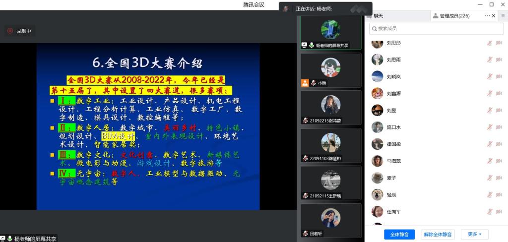 讲座中,杨松林教授详细介绍了对创新创业大赛的理解,从参加创新创业赛事的意义收获、作品如何开展、评委视角如何评审等角度进行了经验分享。杨教授从3D的主要应用入手,介绍了3D技术的特点及应用领域,详细讲解了如何学习和掌握3D技术;随后,杨教授以全国3D大赛为例,详细介绍了全国3D大赛赛事、比赛规则、评审要点等内容与宝贵经验;最后,杨教授对往届优秀作品进行了展示与讲解,同时结合这些优秀作品和自身经验,为同学们提供了创作思路,激发了同学们的创作热情。讲座最后,杨松林教授与与会师生进行交流,解答了同学们的疑问,同时鼓励大家积极参加创新创业大赛,在各类创新创业平台上展现自己的风采。