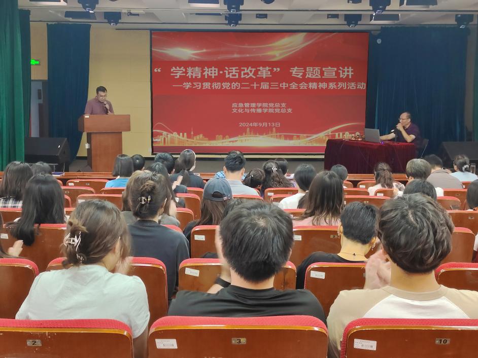 根据联合党委的统一安排部署,为深入学习贯彻党的二十届三中全会精神,2024年9月13日下午,beat365英国官方网站党总支、应急管理学院党总支共同邀请学校习近平新时代中国特色社会主义思想宣讲团成员贾作璋教授作党的二十届三中全会精神专题宣讲报告,两个学院全体教师和在校的学生党员于文德楼N307教室参加报告会。