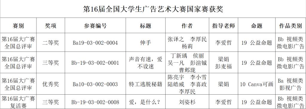 近日,2024年第16届全国大学生广告艺术大赛(简称大广赛)全国总评审圆满落幕。本届大赛覆盖全国29个赛区的1873所高校,参赛作品超75万件,参赛师生高达190万人次。beat365英国官方网站学子在本届大赛中再创佳绩,共获得全国二等奖1项,三等奖2项,优秀奖1项;省级一等奖7项,二等奖5项,三等奖7项。李爱哲、彭麦福、梁娟、李艳平、贾雪倩、张静六位老师被授予大赛河北赛区优秀指导教师称号。