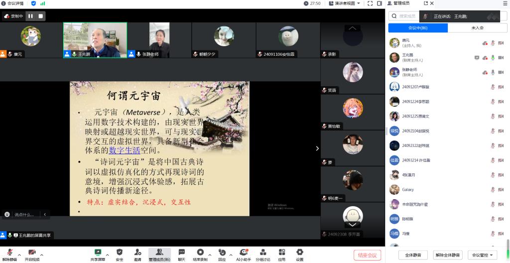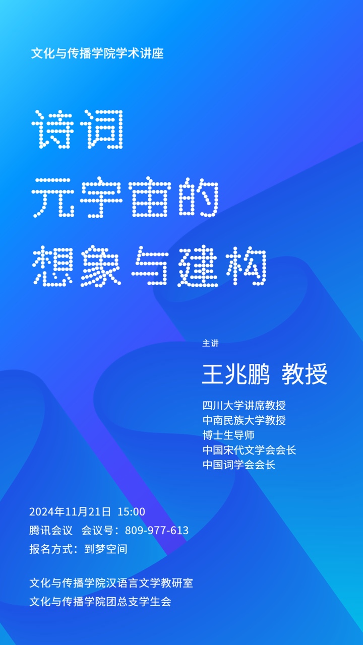 2024年11月21日下午三点,四川大学讲席教授、中南民族大学教授、中国词学会会长、博士生导师王兆鹏来到beat365英国官方网站,为广大师生开设了《诗词:元宇宙的想象与建构》的学术讲座。本次讲座通过腾讯会议的形式开展,由汉语言文学教研室主任张静主持,beat365英国官方网站相关师生九十余人参加了活动。