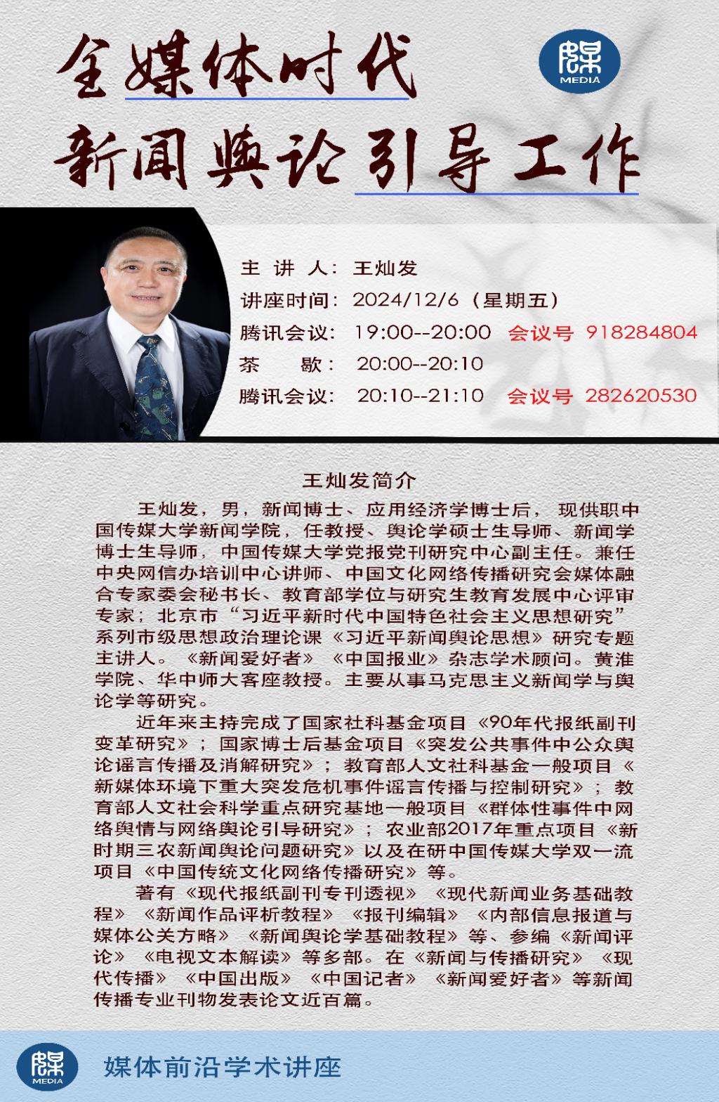 12月6日,中国传媒大学新闻学院王灿发教授莅临我院,为网络与新媒体专业师生做了题为《全媒体时代新闻舆论引导工作》的学术讲座。王灿发教授重点解析了舆论引导的工作机制、基本法则,并介绍了创新改进网上舆论工作的新方法和新手段等。