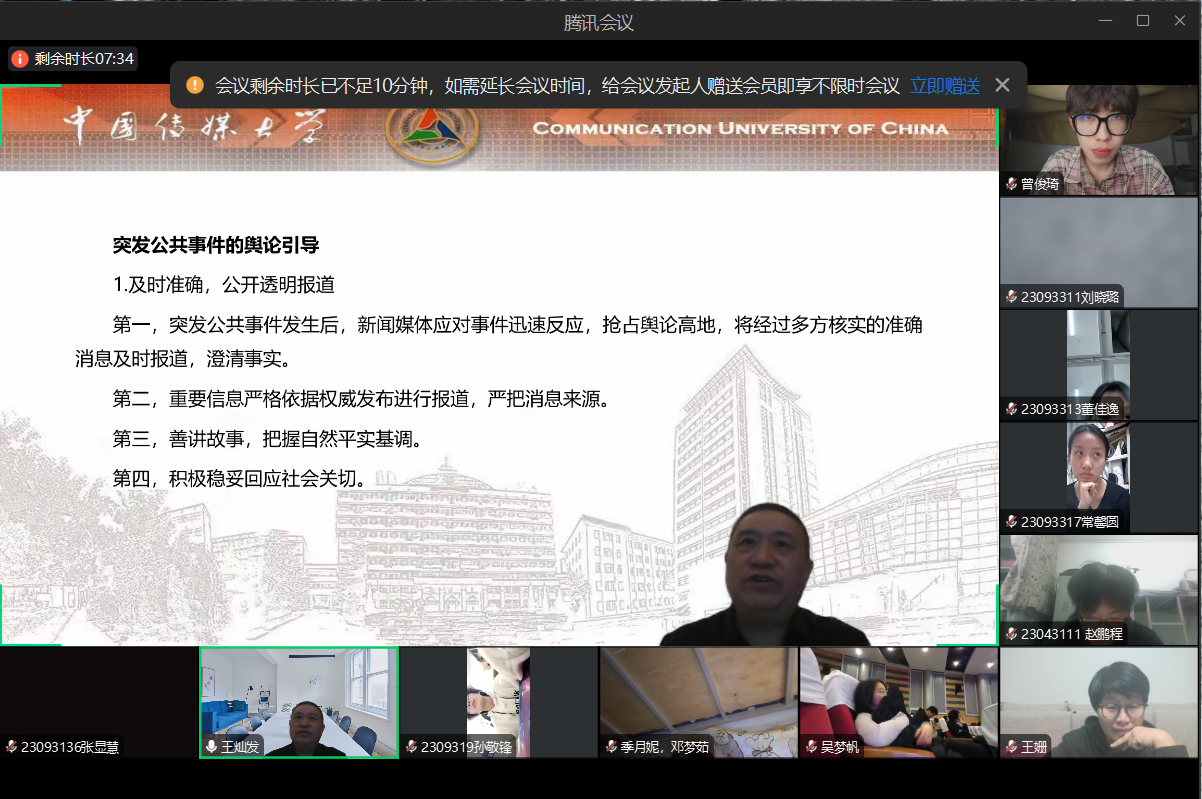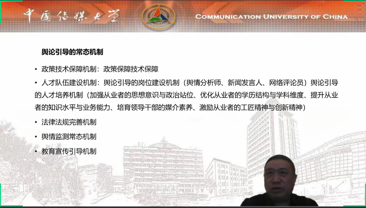 王灿发教授强调了舆论引导的三个基础理论,即劝服理论、议程设置理论、沉默螺旋理论;两项重要原则,即舆论引导的一般原则时效性原则,一般原则包括速报事实,慎报原因,就事论事等;四条新时代舆论引导的新要求,包括围绕国际国内形式、媒介技术、国际舆论格局变化展开等。