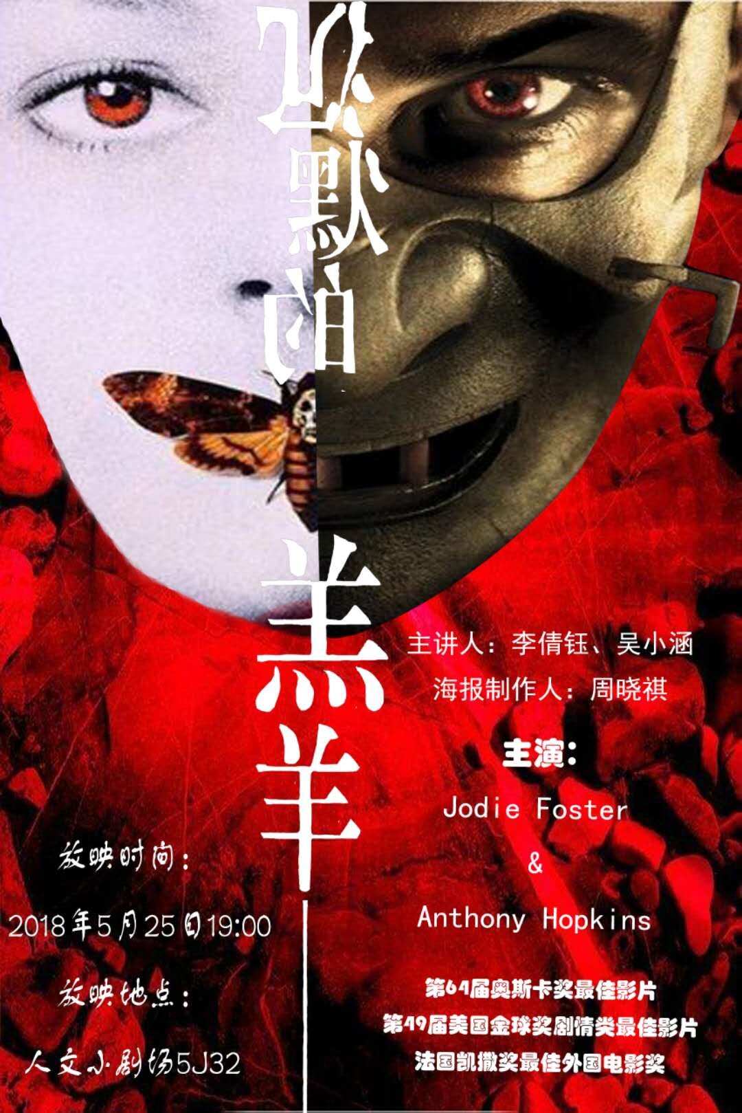 人文电影赏析活动将于5月25日(周五)晚七点,在人文小剧场(5J32)举行,本周将放映经典电影《沉默的羔羊》。该片根据著名小说家托马斯·哈里斯的同名小说改编而成,是深刻反映美国社会犯罪问题的经典之作。影片故事继承了好莱坞恐怖片的传统,然而影片的叙事方式却突破了常规的模式,它颇具匠心地将恐怖片与侦探片巧妙地结合成一体。虽然影片的场景设置以封闭的室内环境为主,缺乏激烈火爆的动作性,但由于采用了希区柯克式的悬念手法和现代恐怖片的心理分析方法,使得整部影片的情节扑朔迷离,将观众引入了一个象征性的人类潜意识的世界。影片通过探索人物心理疾患,试图探寻当代美国社会犯罪的根源,这使得影片的主题得以深化,寓示了好莱坞文以载道的策略。1992年,该片获得第64届奥斯卡奖最佳影片、最佳男演员、最佳女演员、最佳导演、最佳改编剧本5项奖项。本期讲解员:李倩玉、吴小涵;海报制作:周晓祺;指导老师:张静。欢迎广大师生前来观看。