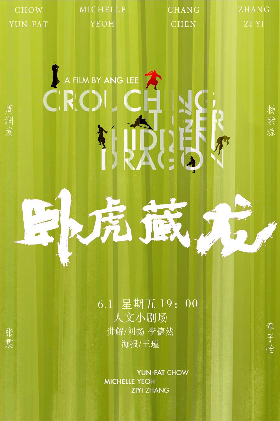人文电影赏析活动将于6月1日(周五)晚七点,在人文小剧场(5J32)举行,本周将放映经典电影《卧虎藏龙》。2001年,导演李安携《卧虎藏龙》奔赴奥斯卡,获得十项提名,并最终捧得最佳外语片等四项奖项,《卧虎藏龙》将中国人的名字第一次写入了奥斯卡最佳外语片一栏。如痴如醉的美景和让人眼花缭乱的打斗让国际社会见识到了中国武侠的魅力,也掀起了国内影坛新一波武侠电影风潮。片中,李安一改其所擅长的情感伦理片风格,从更为现代的全新角度将中国古典美学传统和情感理念诠释到一个新的高度。本期讲解员:刘扬、李德然;海报制作:王瑾;指导老师:张静。欢迎广大师生前来观看。