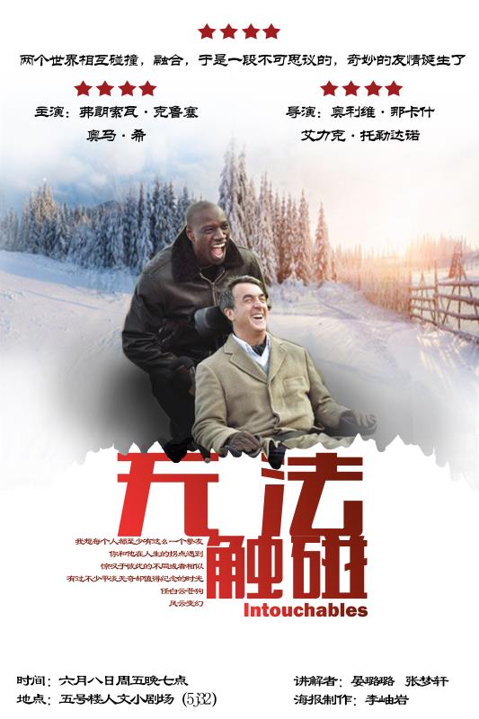 人文电影赏析活动将于6月8日(周五)晚七点,在人文小剧场(5J32)举行,本周将放映经典电影《无法触碰》。《无法触碰》是一部由奥利维·那卡什执导的法国电影,改编自一名法国富翁的自传《第二次呼吸》。两个性格截然不同,又来自不同地域和阶层的人物,由于文化背景和语境习惯,在一场偶遇中碰撞出火花,亦庄亦谐,从冲突走向理解,最后皆大欢喜。《无法触摸》选择了法国现实社会中的种族组合——白人残疾富翁和黑人贫穷护工,因为他们各自真诚的宽容,超越了法国社会日显裂纹的阶级矛盾。本期讲解员:晏璐璐、张梦轩;海报制作:李岫岩;指导老师:张静。欢迎广大师生前来观看。