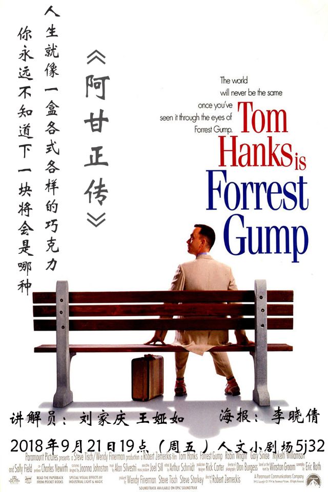 人文电影赏析活动将于9月21日(周五)晚七点,在人文小剧场(5J32)举行,本周将放映美国经典电影《阿甘正传》。这部电影改编自美国作家温斯顿·格卢姆于1986年出版的同名小说。电影中描绘了先天智障的小镇男孩福瑞斯特·甘自强不息,最终“傻人有傻福”地得到上天眷顾,在多个领域创造奇迹的励志故事。阿甘诚实、守信、认真、勇敢,同时又重视感情,对人只懂付出不求回报,也从不介意别人拒绝,他只是豁达、坦荡地面对生活。他把自己仅有的智慧、信念、勇气集中在一点,只知道凭着直觉在路上不停地奔跑。该片表现出的善良、温情,触动了观众心中最美好的东西,从而成为影史上的经典影片。电影上映后,于1995年获得奥斯卡最佳影片奖、最佳男主角奖、最佳导演奖等6项大奖。本期讲解员:刘家庆、王娅如;海报制作:李晓倩;指导老师:张静。欢迎广大师生前来观看。