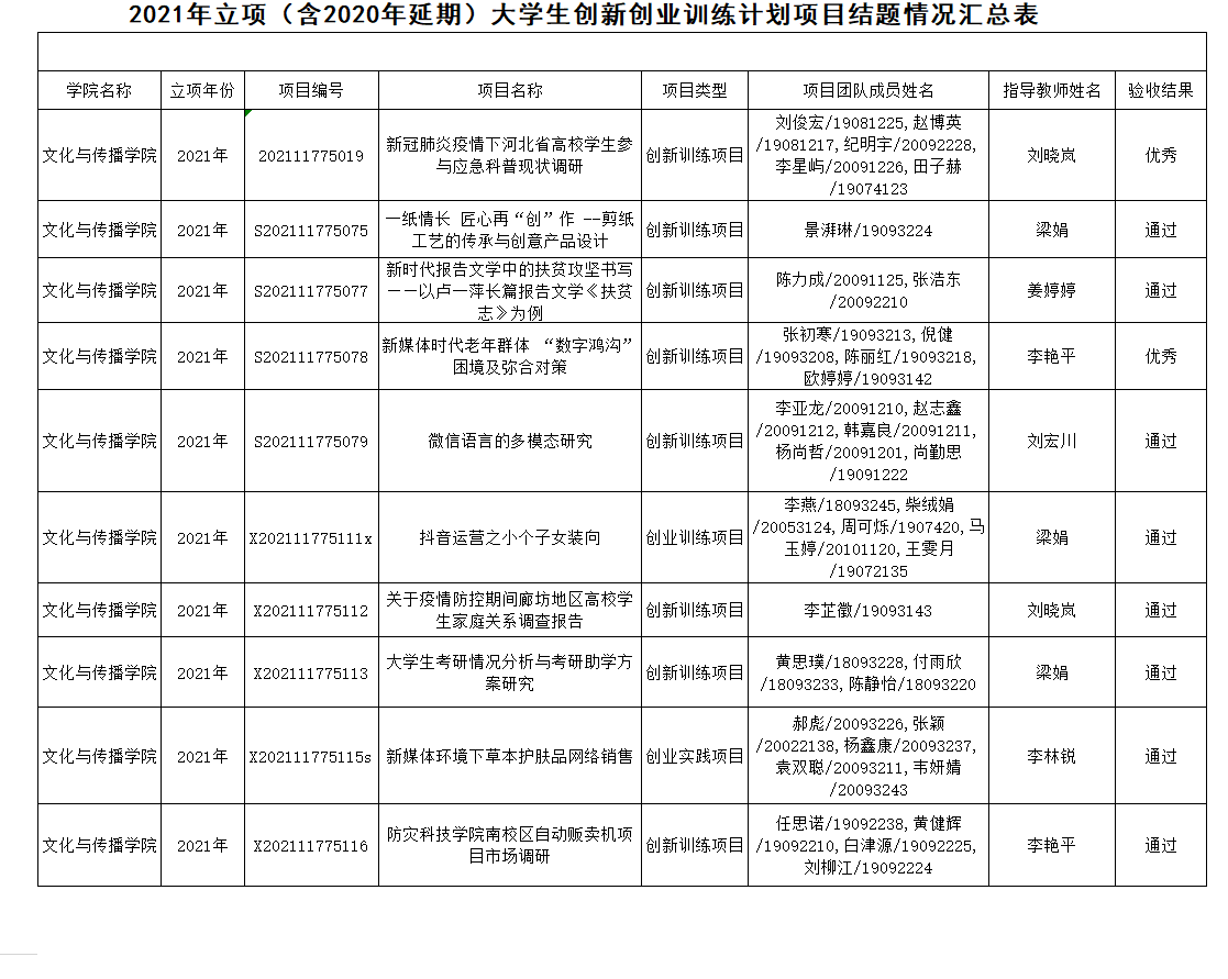 根据大学生创新创业训练计划工作安排,beat365英国官方网站对2021年立项(含2020年延期)的大学生创新创业训练计划项目进行了结题验收工作。经过专家组综合评审,共有十项项目通过结题验收,其中两项评审结果为优秀。现将2021年立项(含2020年延期)的大学生创新创业训练计划项目结项名单公示如下。